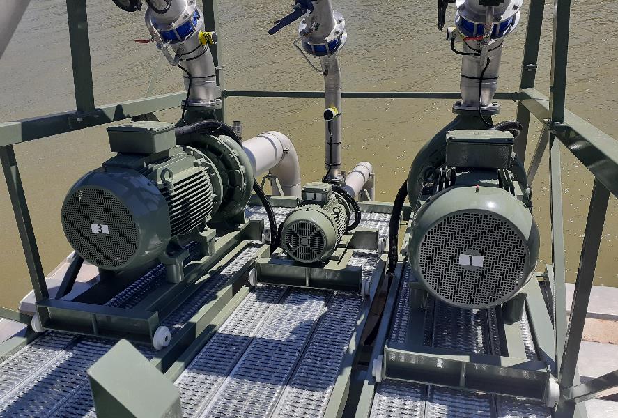 It features two 110 kW pump units with 300 mm stainless steel suction through a foot valve, and more than 20 m of stainless steel discharge pipework. The pontoon system rises and falls with water levels, ensuring uninterrupted pump operation and maintaining constant suction conditions.