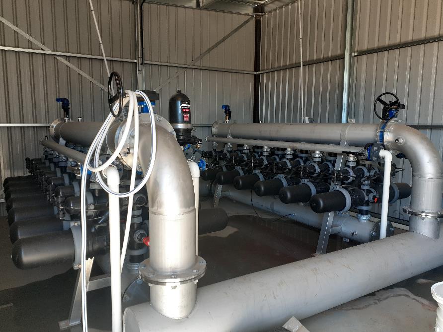 The filter system features twin stainless steel inlet and outlet manifolds for durability, with twin seven pod alpha disc filter on a 250 mm manifold. Alpha disc filters capture particles such as algae and organic matter through a precise, deep-filtration process using compressed, grooved discs. The alpha filters plus the 4 250 mm butterfly valves, help prevent irrigation emitters from clogging, ensuring uniform crop watering, and also extending the system’s lifespan.